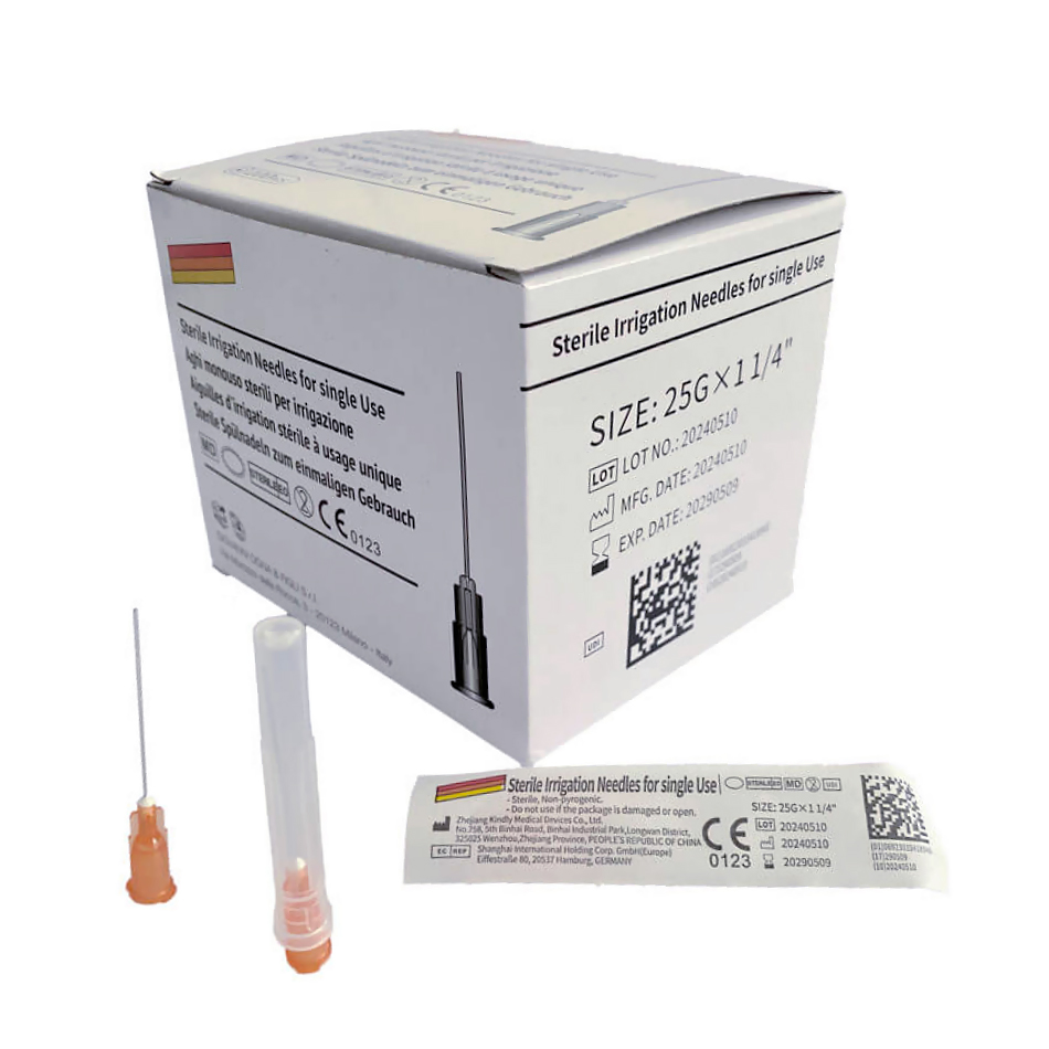 Aghi endodontici e parodontali attacco Luer 25 gauge 0,5 x 32 mm. Punta piatta. Aghi sterili e atraumatici con la punta smussata, innesto a baionetta per lavaggi endodontici e parodontali. Si utilizzano normalmente con siringhe monouso. Misura: (25G32) (diam. 0,5 x 32 mm). sostituisce il codice 7050080