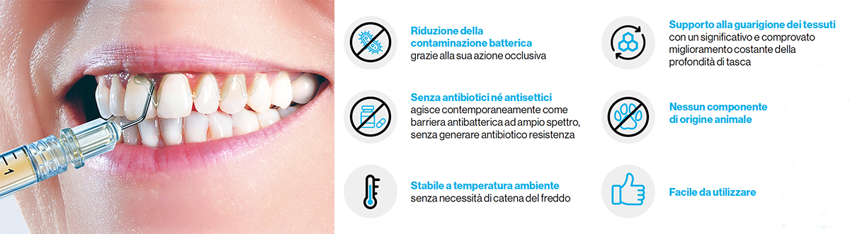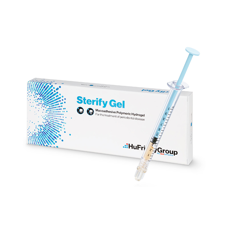 STERIFY GEL È UN DISPOSITIVO MEDICO CHE OFFRE UN NUOVO APPROCCIO ALLA CURA PARODONTALE. Grazie alla sua mucoadesività e composizione, Sterify Gel offre una soluzione unica nel trattamento della malattia parodontale, prevenendo la contaminazione batterica e favorendo la guarigione dei tessuti. Sterify Gel penetra facilmente nelle aree più profonde e difficili da raggiungere delle tasche parodontali e perimplantari, aderendo al tessuto gengivale, all’osso alveolare o alle superfici delle radici e degli impianti dentali, fornendo una copertura completa delle tasche. Sterify Gel può trovare un'applicazione utile nei casi di malattia parodontale cronica da moderata a grave (stadi III e IV) come trattamento aggiuntivo dopo la rimozione meccanica della placca e le operazioni di levigatura radicolare nelle tasche parodontali e peri-implantari (scaling e root planing) Confezione: siringa da 0,3 ml.
