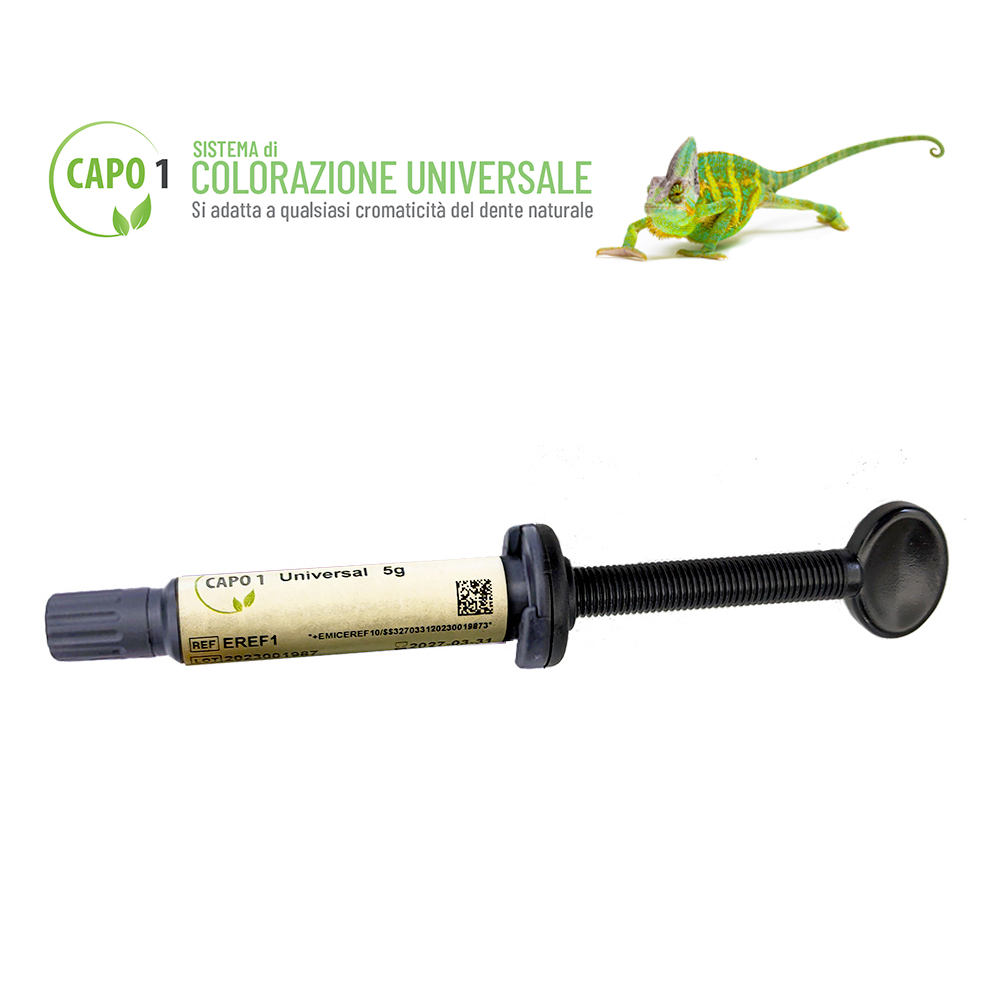 Composito microibrido traslucente per restauri di anteriori e posteriori. EREF1 Micerium. CAPO1: SISTEMA di COLORAZIONE UNIVERSALE <b>Caratteristiche:</b> • Trasparenza molto elevata • Vero effetto camaleonte, restauri invisibili • Il composito si adatta al colore naturale del dente • Una sola massa consente di restaurare elementi dentali di qualsiasi cromaticità • Si adatta a qualsiasi cromaticità del dente naturale • Risultati estetici tempi ridotti alla poltrona Confezione: siringa da 5 gr.