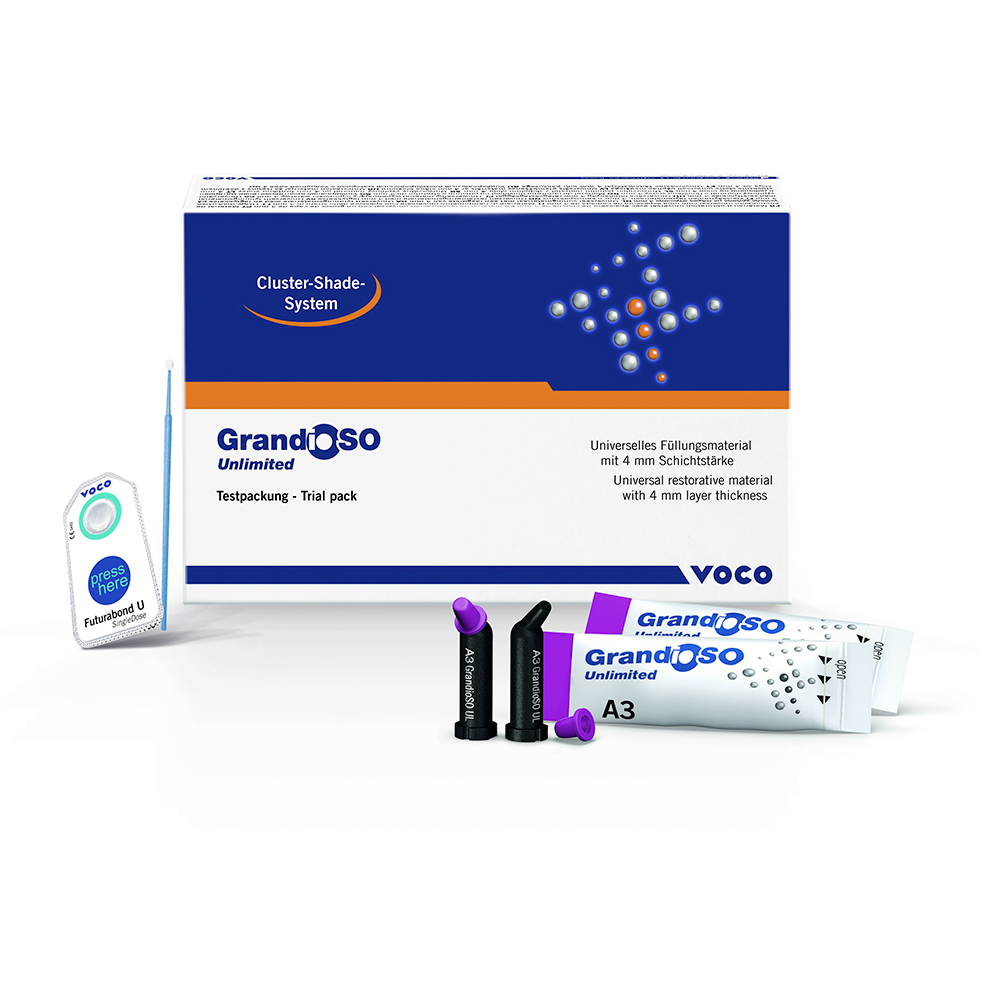 <b>Composito universale compattabile fino a 4 mm di spessore in cinque cluster-shades</b> Mentre i compositi estetici universali devono essere stratificati in modo elaborato e polimerizzati con incrementi di 2 mm, i compositi bulk-fill presentano il vantaggio di poter applicare incrementi fino a 4 mm nella cavità. Tuttavia, i compositi bulk-fill sono utilizzati quasi esclusivamente per l’area dentale posteriore a causa della loro estetica spesso inadeguata. VOCO ha superato questa limitazione con il nuovo composito universale GrandioSO Unlimited. Il materiale estetico può essere applicato in incrementi di 4 mm nella cavità ed è indicato sia per l’area dentale anteriore sia per quella posteriore. D’ora in avanti, quindi, gli studi dentistici possono beneficiare di un unico composito universale compattabile per svolgere il loro lavoro quotidiano! Grazie al sistema di colori semplificato, tutte le 16 tonalità VITA® classical possono essere coperte con solo cinque Cluster-Shade. Ciò consente di soddisfare sempre in modo ottimale qualunque esigenza con soli cinque colori, riducendo significativamente anche lo spazio occupato in magazzino. <b>Indicazioni:</b> • Restauri di cavità di classe da I a V • Ricostruzione di anteriori danneggiati da trauma • Faccette di anteriori con discromia • Correzione di forma e colore per un aspetto estetico migliorato • Immobilizzazione, splintaggio di denti anteriori • Riparazione di faccette • Restauro di denti decidui • Build-up di moncone sotto corone • Inlay in composito <b>Vantaggi:</b> • Universale: per elevate esigenze estetiche nell‘area dentale anteriore e posteriore • Nessuna stratificazione: incrementi fino a 4 mm di spessore • Eccellente manipolazione: ottime proprietà di modellazione e lucidatura • Composito ad alte prestazioni: 91% di contenuto di riempitivo per la massima stabilità e resistenza • Sistema di colori semplificato: le 5 Cluster-Shade consentono di coprire tutti i 16 colori VITA® classical • Efficiente: significativo risparmio di spazio in magazzino Confezione Trial Pack (test Kit) cod. 6257 Voco: • n. 10 Caps x 0,3 g. Cad (2 per ciascuno di A1, A2, A3, A3.5, A4), • n. 10 × Futurabond U SingleDose, • Scheda cromatica • Accessori