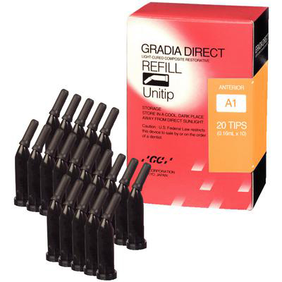 Composito fotopolimerizzabile per restauri – ricambio 20 capsule Unitip A3,5 Anterior Standard 1970 GCCon il nuovo Gradia Direct si possono eseguire in studio tutti i restauri fino a quelli più impegnativi dal punto di vista estetico, utilizzando un unico materiale semplice da usare. Indipendentemente dal fatto che si tratti di una procedura a colore unico o a più colori, Gradia Direct permette di ottenere, in modo più semplice e veloce, un restauro duraturo dall'aspetto naturale. Poiché il colore si adatta perfettamente alla struttura dentaria circostante, già con un unico colore si possono facilmente ottenere restauri di qualità estetica eccellente. Combinando diversi colori si apre una serie illimitata di possibilità per ottenere risultati estetici, utilizzando però al massimo tre colori per un restauro anteriore e due colori per un restauro posteriore.