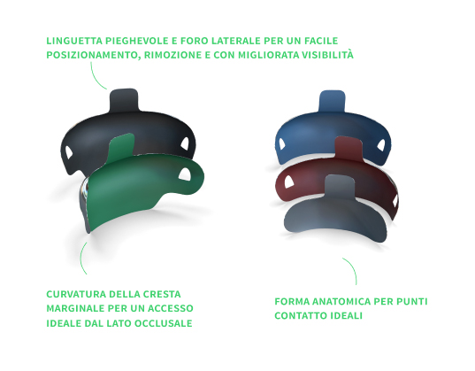 <b>Matrici sezionali in acciaio inossidabile ultrasottile con forma anatomica.</b> Le matrici sezionali Halo sono in acciaio inossidabile ultrasottile, da 0,038 mm, la loro forma anatomica assicura punti di contatto stretti a garanzia della longevitą del restauro. In particolare, la curvatura della cresta marginale consente un accesso ideale dal lato occlusale, riducendo il tempo di rifinitura. Disponibili nella versione Original per una migliore adattabilitą e brunitura, nella versione Firm, restistono alla deformazione e sono adatte per spazi interprossimali ristretti e, nella versione Firm non-stick, codificate per colore. Sono dotate di linguetta pieghevole e foro laterale per un facile posizionamento e rimozione con visibilitą migliorata. <b>Caratteristiche:</b> • Forma anatomica per punti di contatto ideali • La curvatura della cresta marginale consente un accesso ideale dal lato occlusale, riducendo il tempo di rifinitura • Linguetta pieghevole e foro laterale per facile posizionamento e rimozione con visibilitą migliorata • Matrici “Original” per una migliore adattabilitą e brunitura • Matrici “Firm” resistono alla deformazione e sono adatte per spazi interprossimali ristretti • Matrici “Firm nonstick“, codificate per colore • Le matrici “Original” e “Firm” sono in acciaio inossidabile ultrasottile da 0,038 mm HALO FIRM NON-STICK MATRICI 5,5mm - confezione da 10 pz. - Cod. 5054 Ultradent